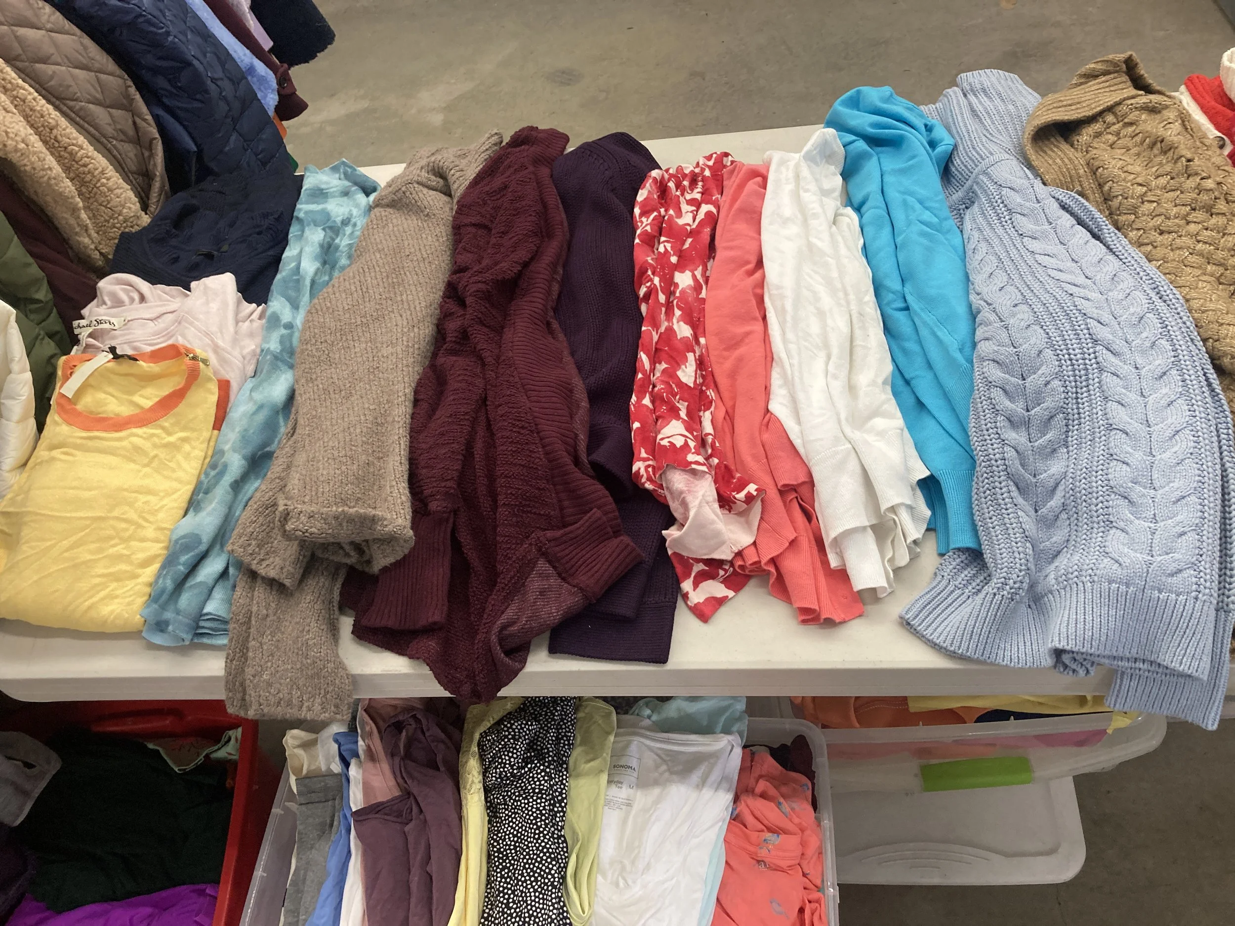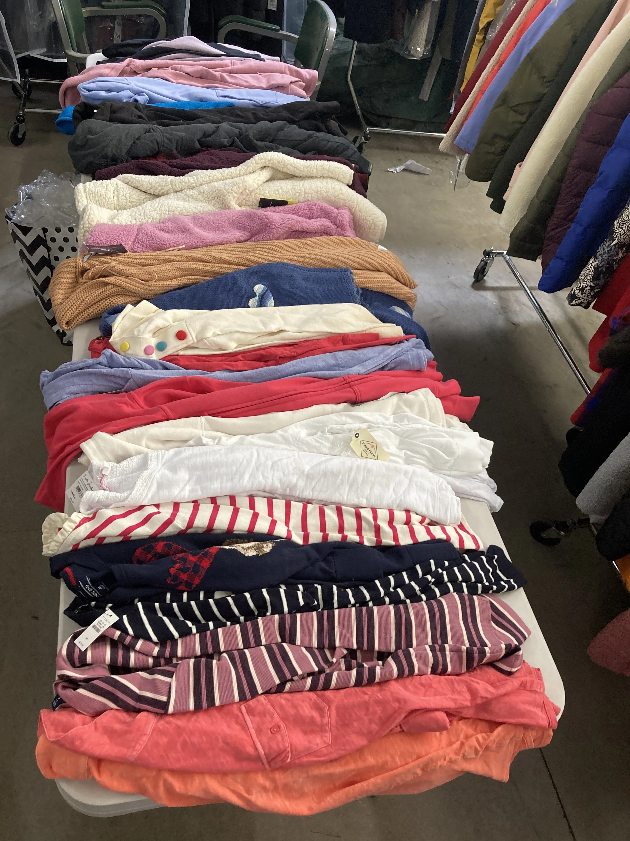 This sale is incredibly packed with clothing. Not just any clothing. This is NEW, NEW, NEW! That's right; New unused! New with Tags! And New within the last three years! NEW! NEW! NEW! Incredible! You will not want to miss this sale.